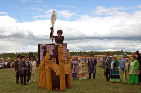 Затем хозяин прошлогоднего Ысыаха Олонхо, глава Мирнинского района Ильдар Султанов передал официальный символ праздника – Ытык Дуо±а главе Нюрбинского района Борису Попову. Гостей и участников поздравили заместитель председателя правительства Феодосия Габышева и народный депутат республики, вице-спикер Государственного собрания (Ил Тумэн) Александр Жирков.