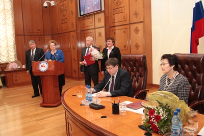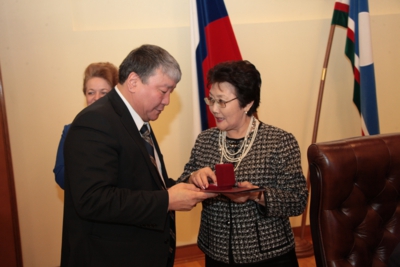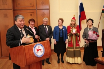Вице-спикер парламента Александр Жирков вручил Анастасии Божедоновой Благодарность Председателя Государственного Собрания (Ил Тумэн) с серебряным знаком и отметил, что коллеги из других стран уважали ее как истинную посланницу нашей северной земли. Также Александр Николаевич подарил для юбиляра туесок, который передали земляки – мастера выставки «Туос тойуга» объединения народных мастеров Уус-Алданского улуса. «Пусть этот туесок будет полон и всегда напоминает о наших народных умельцах», - сказал Александр Жирков.