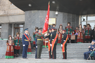 После выступления ветеранов зазвучал знаменитый марш «Прощание славянки» и символ Знамени Победы был передан представителям молодежи – кадетам. От имени молодежи республики выступил председатель молодежного совета Федерации профсоюзов республики Константин Филиппов. Обращаясь к ветеранам, он сказал, что молодое поколение понимает всю значимость боевого и трудового подвига старшего поколения ценой своей жизни отстоявшего свободу и независимость страны, понимает ответственность за их сегодняшнее благополучие и за сохранение вечной памяти об их подвиге.
